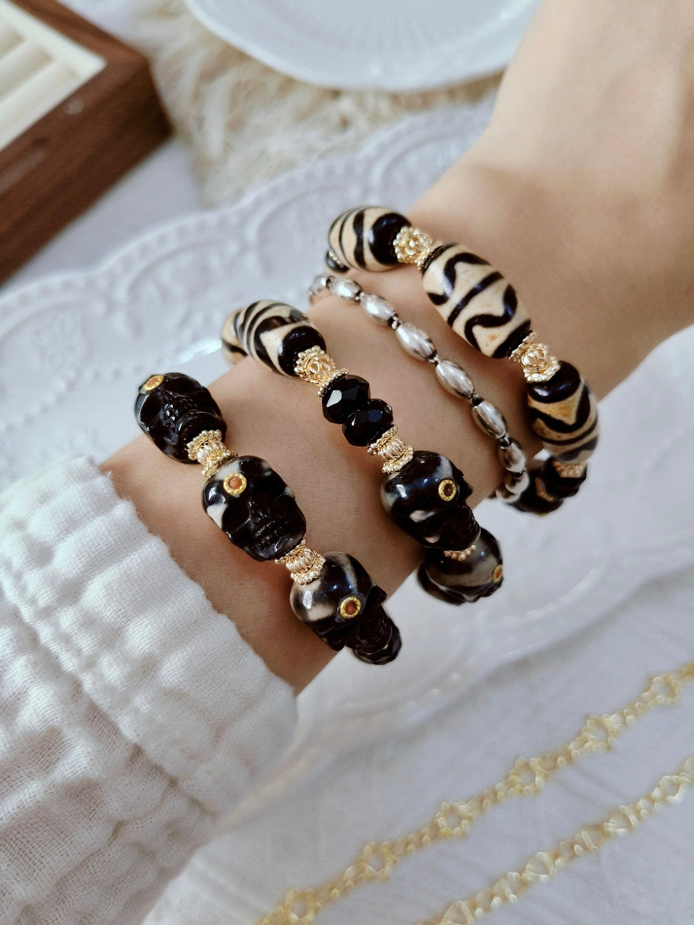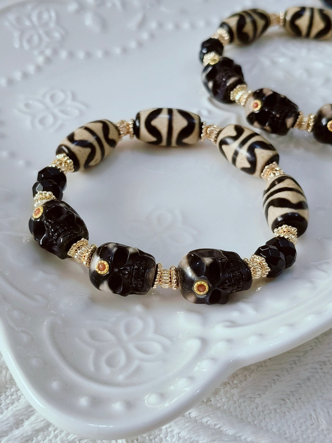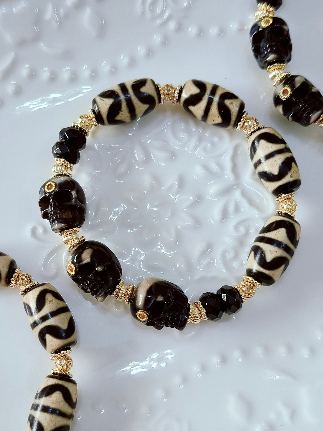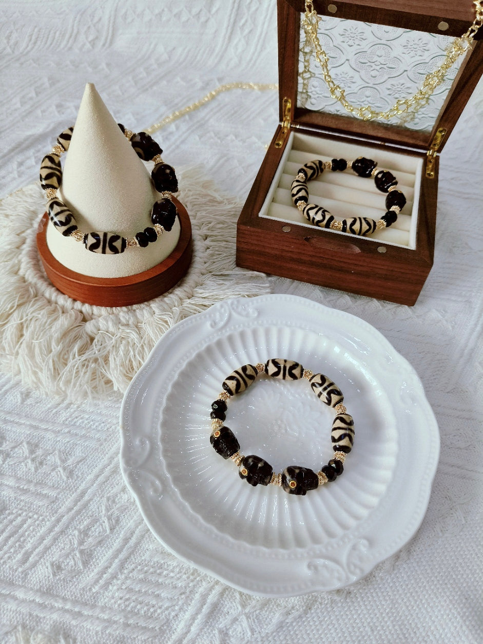 This bold combination of Double Tiger Tooth Dzi beads and Tibetan-style skull charms isn’t just for looks — it’s made for those walking through challenges, negativity, and unseen interference.